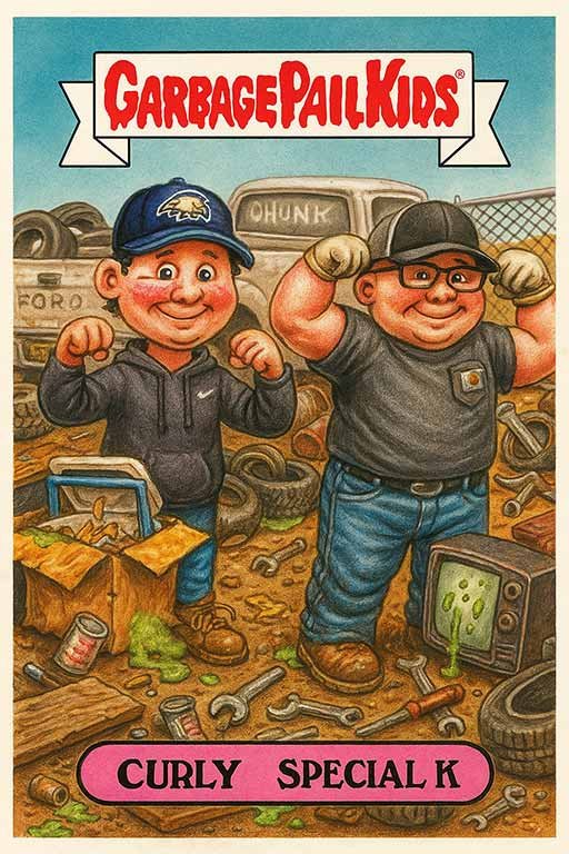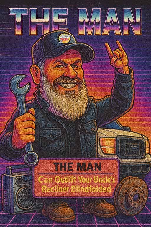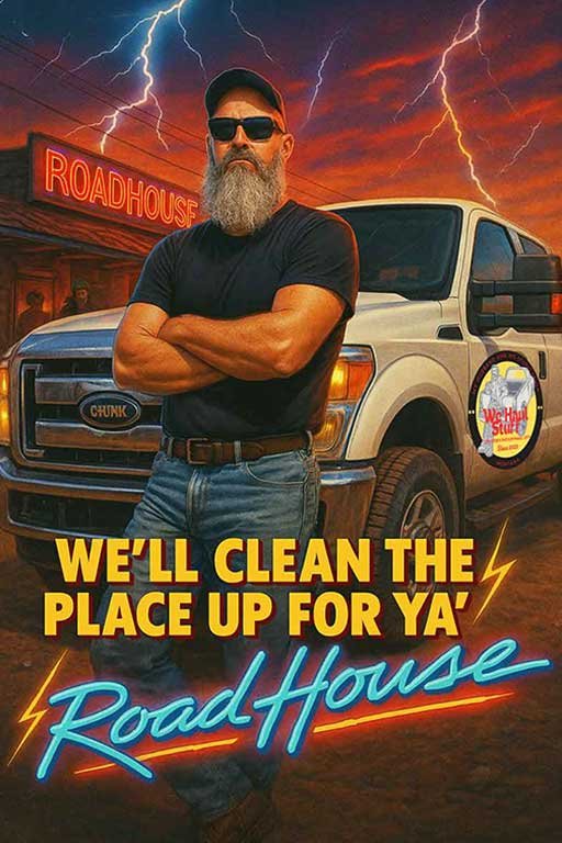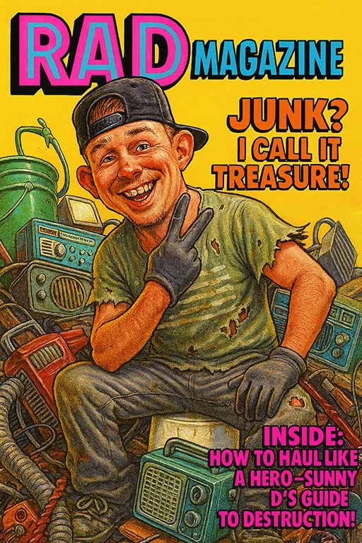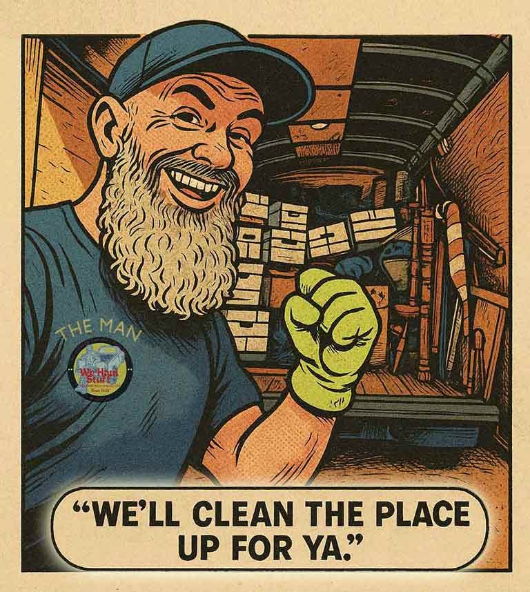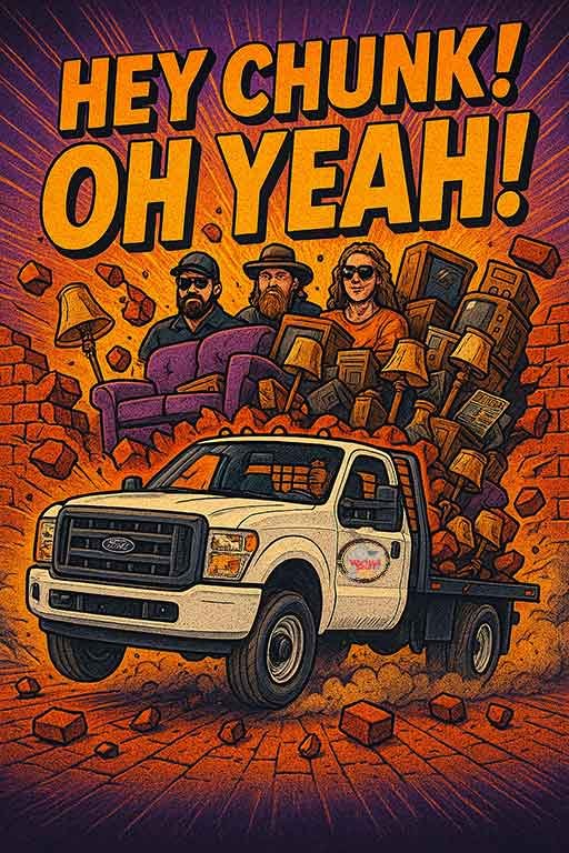 … a flatbed Ford named Chunk roars to life every morning, hauling couches, fridges, broken dreams, and your ex’s old recliner. Behind the wheel? The Man himself — backed by a crew of family, friends, and summertime student muscle ready to rock your junk pile into oblivion.